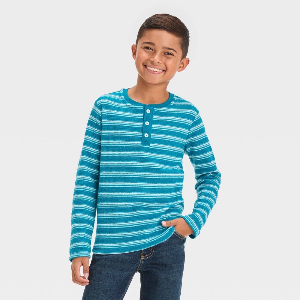 This Long-Sleeve Thermal Henley Shirt from Cat & Jack™ adds a fun staple to their cool-weather wardrobe. Crafted from midweight fabric and boasting a thermal construction, this long-sleeve henley shirt brings cozy comfort to their day. Designed with a henley neckline with a front three-button placket and a length that reaches below the waist, they can pair this striped tee with different bottoms for versatile wear options. Cat & Jack™: Classics with an imagination of their own.