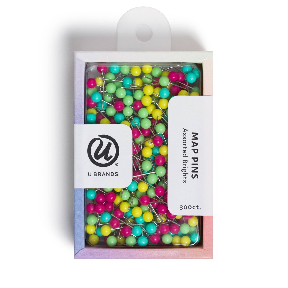 U Brands® 300 Count Map Push Pins in assorted colors are crafted to brighten up any office or work space. Ideal for marking locations, points of interest, travel routes, addresses and more on world maps. These tacks provide a fun, innovative way to plan out that next travel destination! Packaging created with the environment in mind, cut down waste and use the FSC® certified paper box to store and organize your office accessories in a drawer or displayed on your desk
