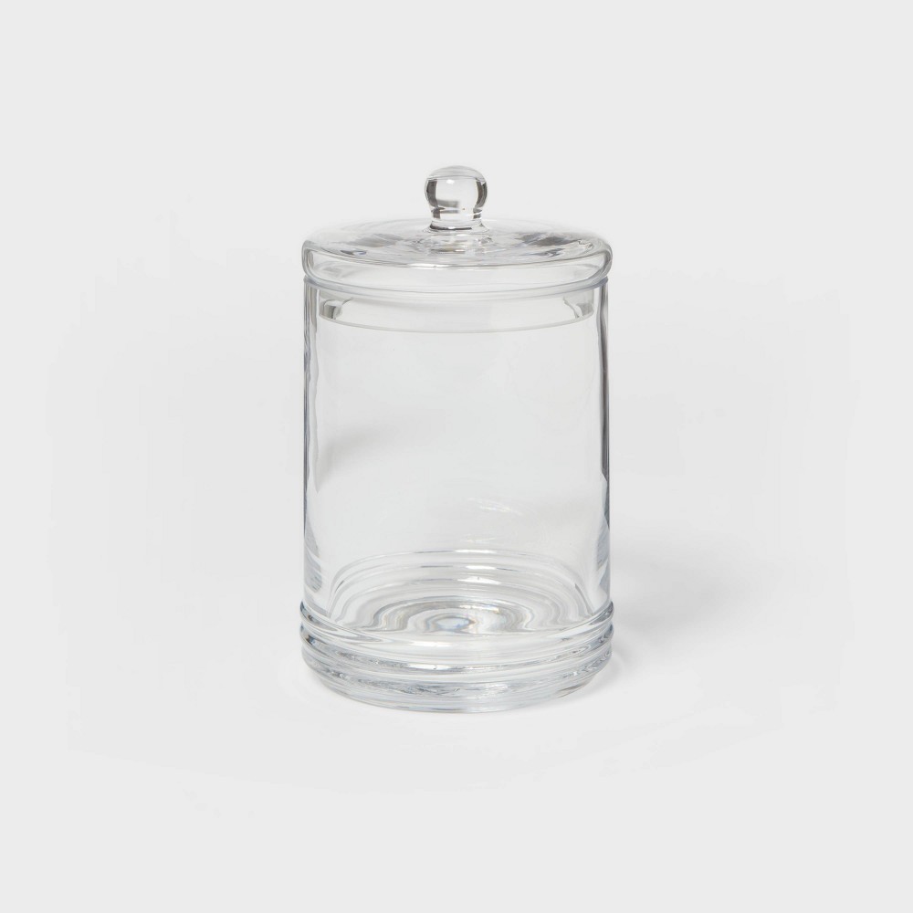 Bring sleek storage to your bathroom countertop with the Medium Glass Apothecary Canister from Threshold™. This clear round glass canister comes with a lid, keeping whatever you stash inside protected from moisture and dust. The rounded glass knob on the lid makes it easy to take on and off, and the clear glass construction lets you see what you've stored inside and blends in easily with your existing bathroom decor. It's perfect for storing and organizing cotton swabs, cotton balls, bandages and any other small items. Threshold™: Quality & Design / Casual classics for house and home.