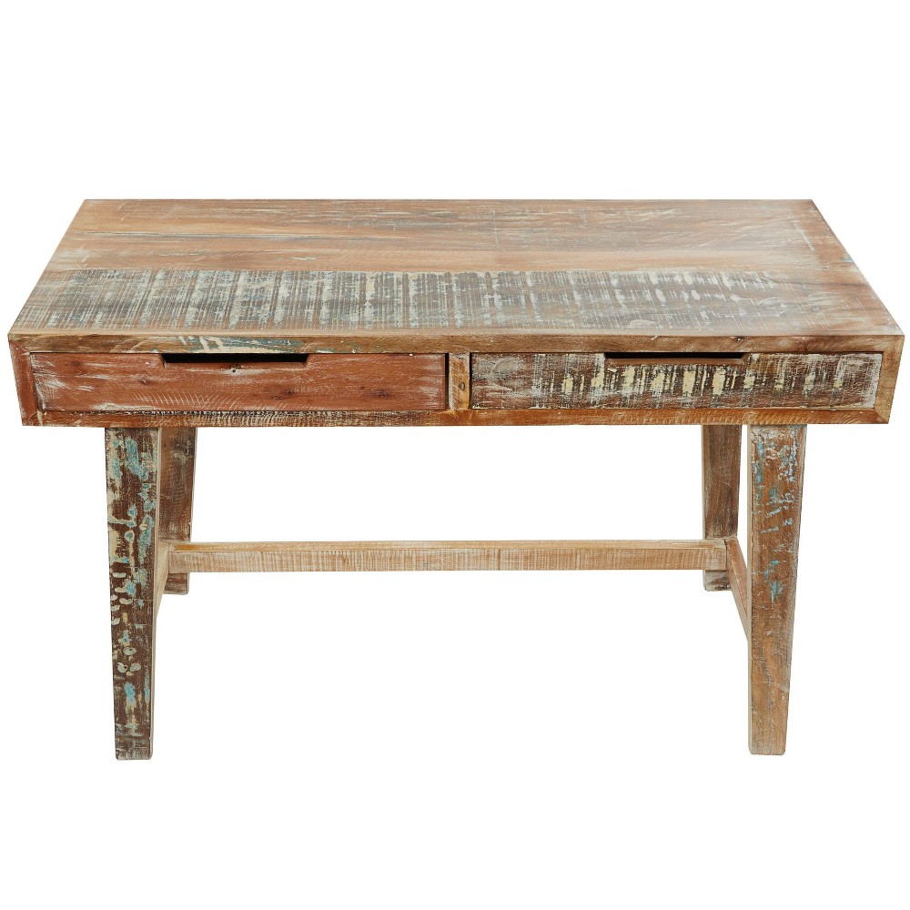 Use this large wood desk table in your study or bedroom and add an accent flower vase to its surface for a touch of rustic charm. This item ships in 1 carton. Brown desk features 2 drawers with 25 lbs weight limit. Due to the handmade nature of this item, no two will be alike, there will be slight differences in shape, size, and color. Suitable for indoor use only. Maximum weight limit is 100 lbs. Made in India. This is a single desk. Rustic style.
