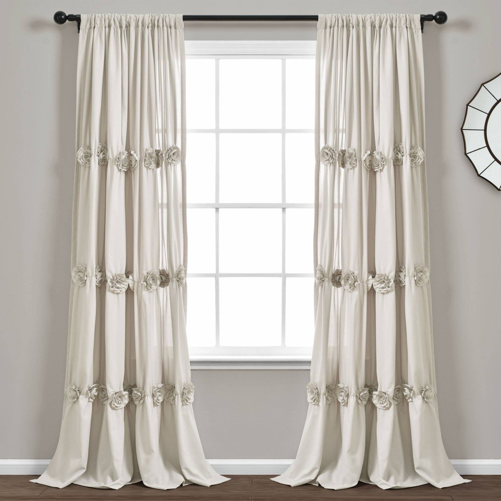 Give your windows a romantic, parisian chic look with this Darla Window Curtain featuring rows of hand-crafted flower embellishments. Pretty, elegant, and unique are all words that describe these window panels. This Darla Window Curtain will instantly brighten any room they're in, from primary bedrooms to nurseries. This Darla Window Curtain is unlined, meaning it will allow a good amount of natural light into your home. But your neighbors won't be able to see inside. Our Darla Window Curtain is available in multiple color options, making it easy to fit the look into your existing decor theme. This curtain style is sold by the single panel. Each panel will measure 40 inches in width and 84 inches in length. Installation is easy with a three-inch rod pocket. It simply slides right onto your curtain rod. Or you can hang the panels from the rod with clip rings for a bit of added length. Because the floral embellishments are delicate, these panels are labeled dry clean only. Please do not machine wash or dry these curtains. Part of the Darla Collection.