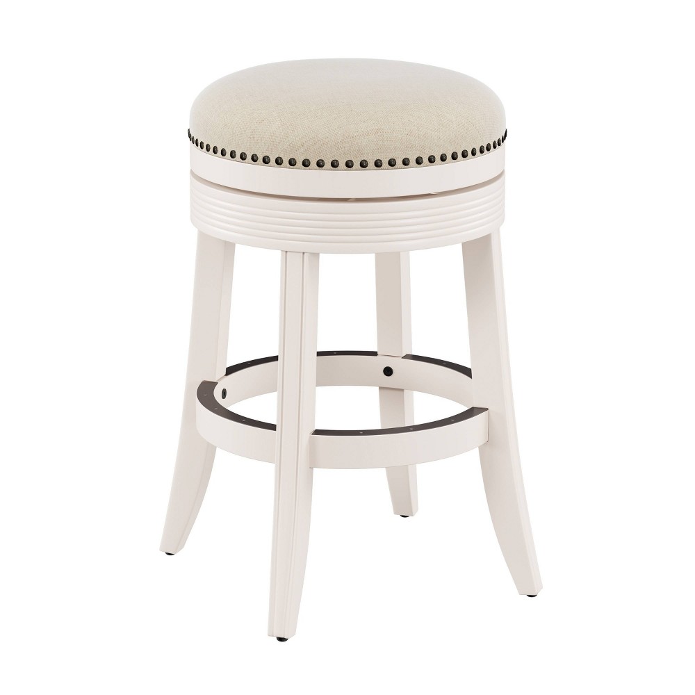 Understated and simply conceived, the Hillsdale Furniture Tillman Backless Swivel Counter Height Stool is timeless in design and versatile in style. White finished wood and light beige upholstery have a breezy and refreshing aesthetic. The fluted wood work and stately nail head trim give a traditional twist to this modern counter stool. With perfectly placed footrests and 360° swivel functionality, this backless stool is ideal for your kitchen island or counter height dining table. Assembly required.