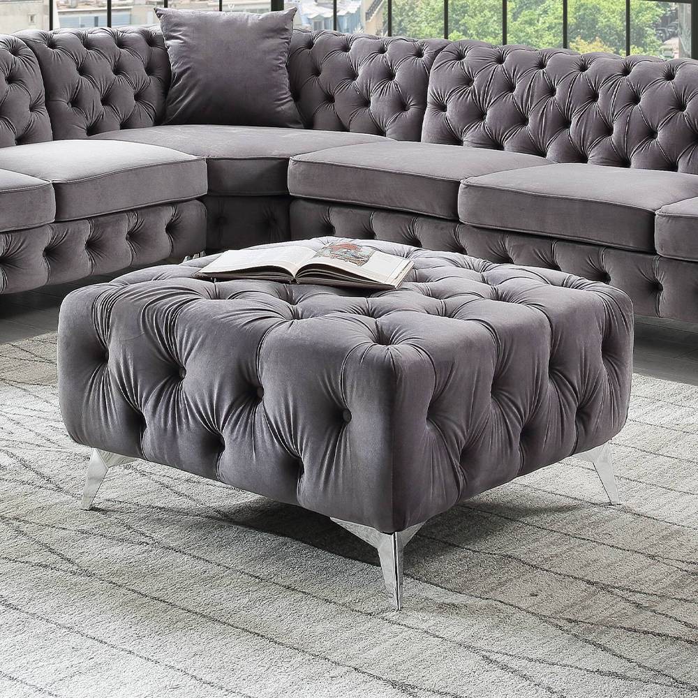 The Wugtyx Sectional by Acme features classic button tufting combined with beautiful upholstery creates a cozy and inviting look that will blend well with any decor. Designed for your comfort and relaxation, the Wugtyx Living Room Collection is fully upholstered in dark gray velvet. It has tight seat and back cushion, and full foam seat construction offers excellent features in durability and comfort. Metal splay legs give the seat elegant support. The attached accent pillows share the same color as the sofa for a cohesive aesthetic. Give your living room an alluring focal point with the Wugtyx Living Room Collection. Matching Ottoman is also available